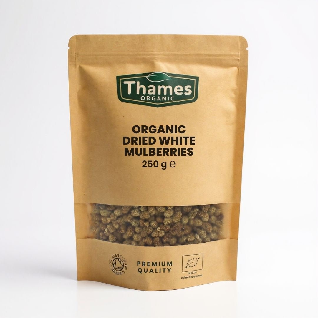 Discover Thames Organic’s Organic Dried White Mulberries – a versatile and delightful addition to your kitchen, catering to a variety of dietary preferences. Whether you’re a vegan, vegetarian, paleo enthusiast, or follow a Mediterranean diet, these premium white mulberries are a must-have. Sourced sustainably from the finest organic mulberry trees, they offer a naturally sweet and slightly tart flavor that enhances your snacking and culinary endeavors. Enjoy them as a nutritious on-the-go snack or add them to your cereals, trail mixes, or yogurt for a burst of natural goodness. Embrace the delightful taste of Thames Organic’s Dried White Mulberries and elevate your culinary experiences with this wholesome and eco-conscious choice.